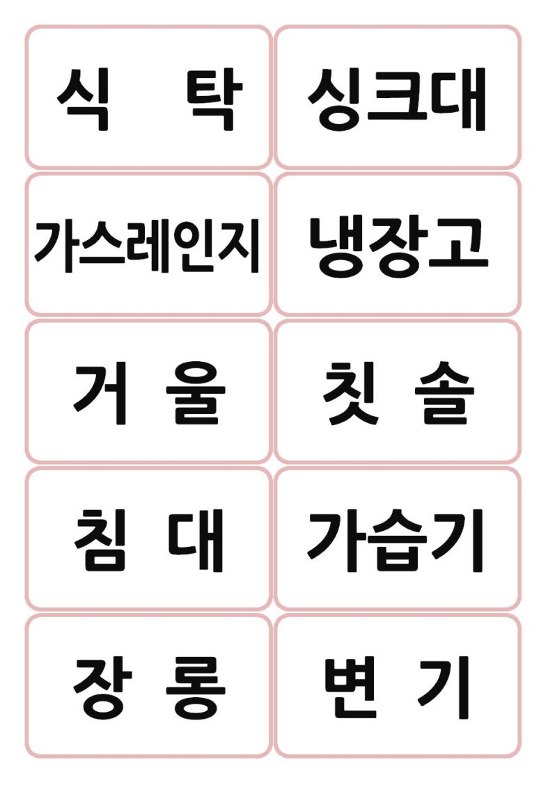 각 분야에 대해 여러 가지로 세분화되어 있습니다. 사람, 집, 의류, 음식, 우리의 주변, 교육, 사무실, 병원, 학교, 동식물 , 스포츠 , 취미 등입니다.